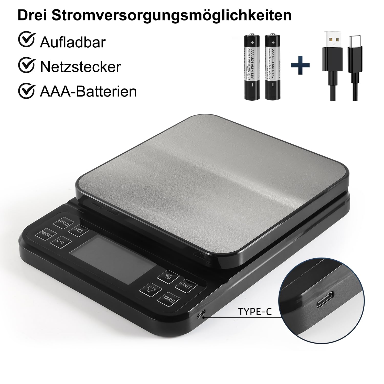 Küchenwaage, einstellbare Abschaltautomatik, Feinwaage Digitalwaage, mit Netzteil und Batterien