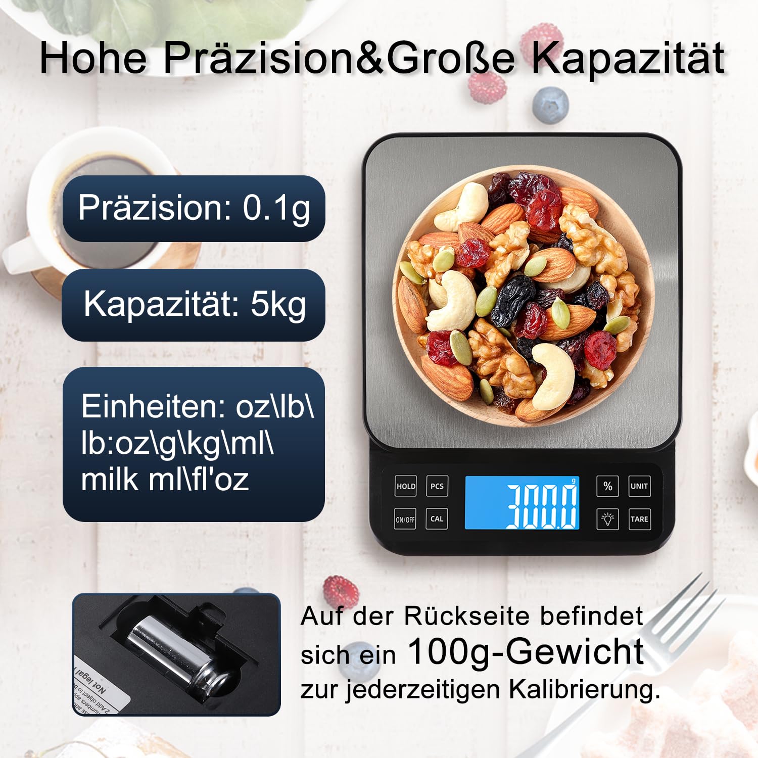 • [0,1 g hohe Präzision, leistungsstarke Funktionen] Ein hochwertiger Sensor bietet eine Präzision von 0,1 g und einen Messbereich von 0,5 g bis 5 kg. Zu den leistungsstarken Funktionen gehören: Prozentfunktion, Tarierung, Haltefunktion, Einheitenkonvertierung, Zählfunktion, automatische Abschaltung(einstellbar oder deaktivierbar), Kalibrierung usw.