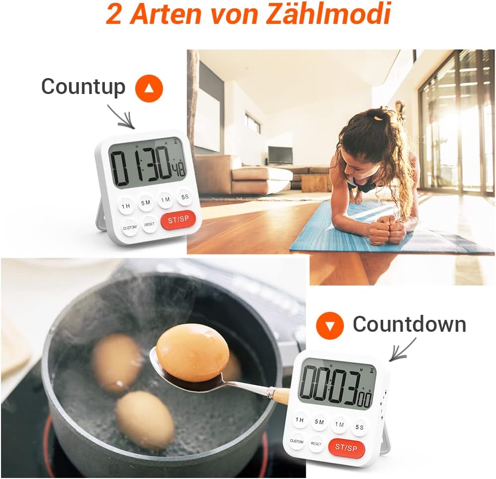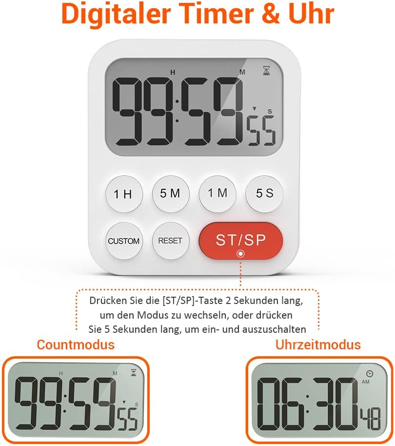 - 【3 in 1: Timer, Stoppuhr und Uhr】Der digitale Küchentimer von gilt als normal digitale Uhr mit 24-Stunden-Anzeige. Inzwischen ist er auch ein Countdown-Timer und eine Stoppuhr. Der maximale Timer-Wert beträgt 99 Stunden, 59 Minuten und 59 Sekunden