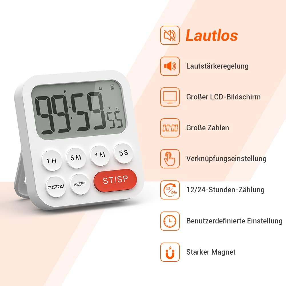 - 【3-stufige Lautstärke】Für den Timer gibt es drei einstellbare Lautstärkepegel: Laut, Leise und Stumm. Schieben Sie einfach die Taste auf der rechten Seite des Timers, um die Lautstärke an Ihre Bedürfnisse anzupassen